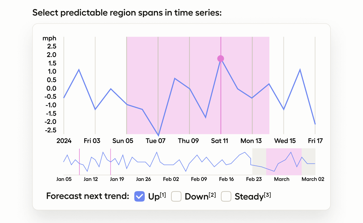 To train a machine learning model to perform forecasting on time series data, create a dataset using this template. This template prompts annotators to highlight predictable region spans in the time series channels and label them as “Regions”, then identify the trend forecast for a specific region.